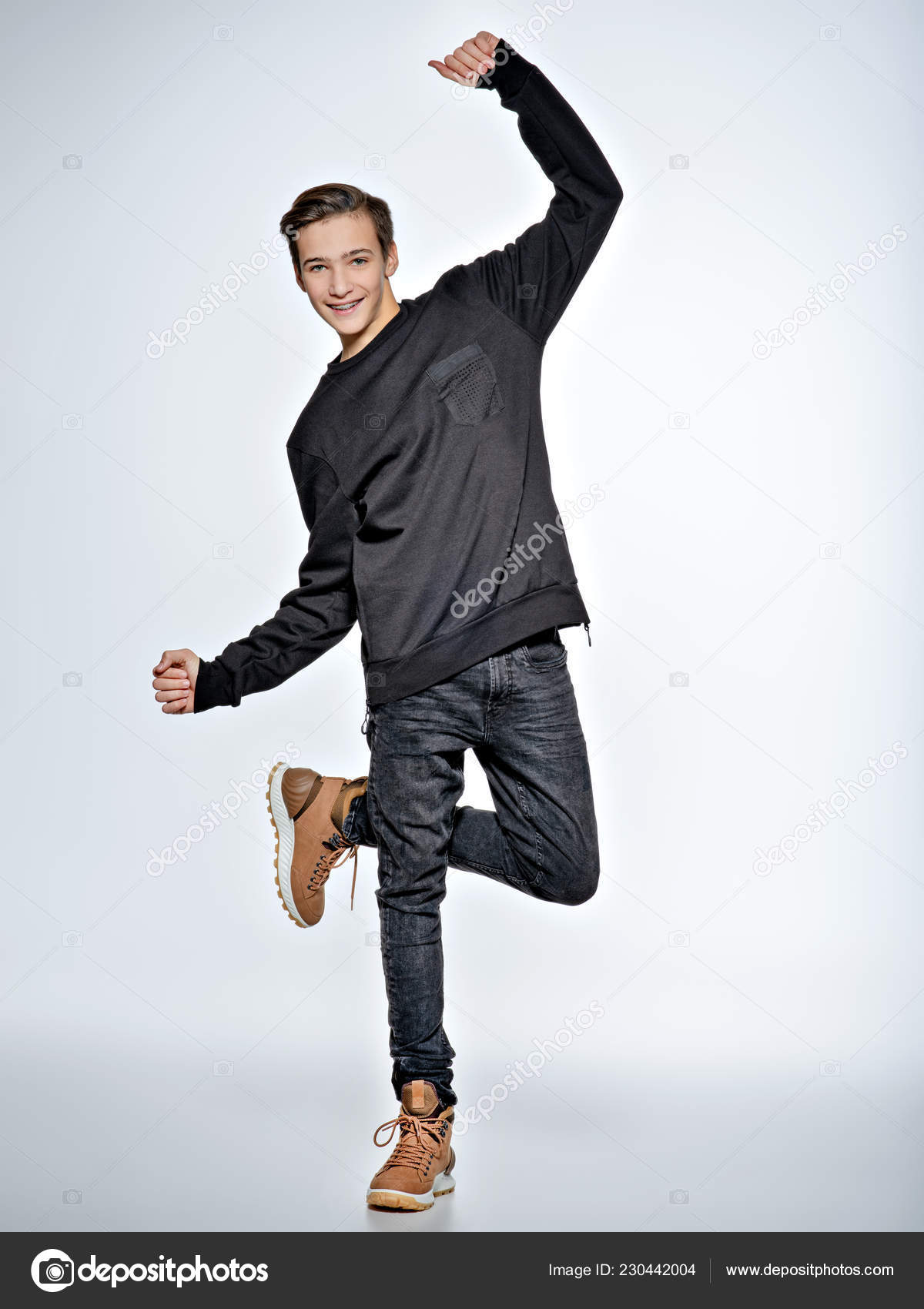 Teen Boy Dancing Teenager Dressed Black Trendy Clothes Posing