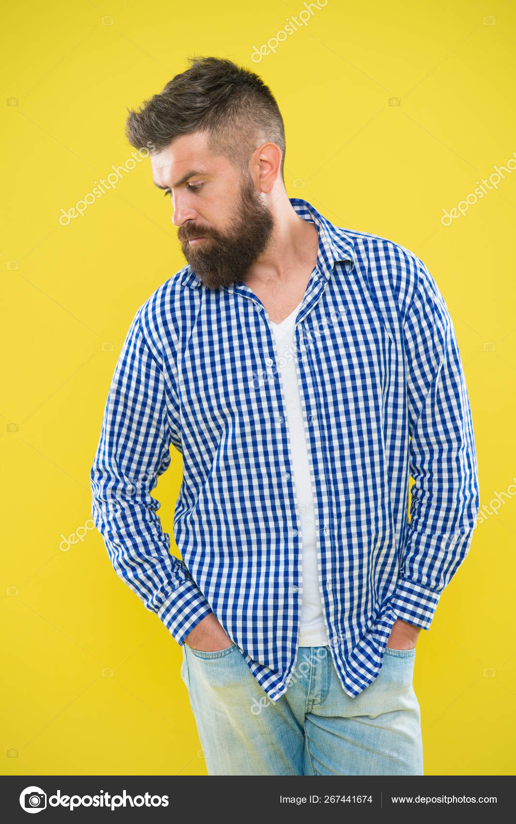 Charismatic Man With Beard On Yellow Background Male Fashion And