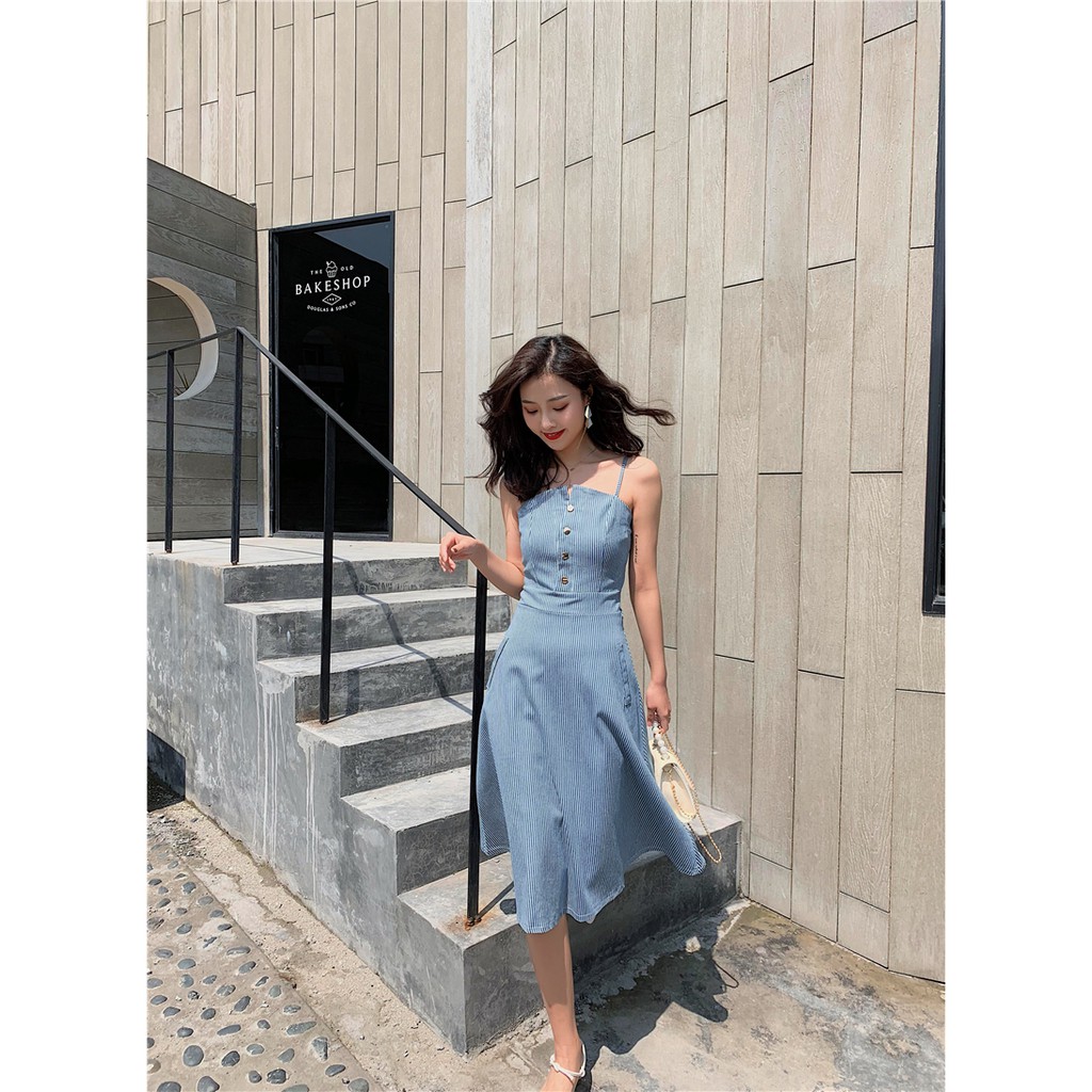 2019 New In Women Trendy Korean Style Denim Striped Boat Neck Midi
