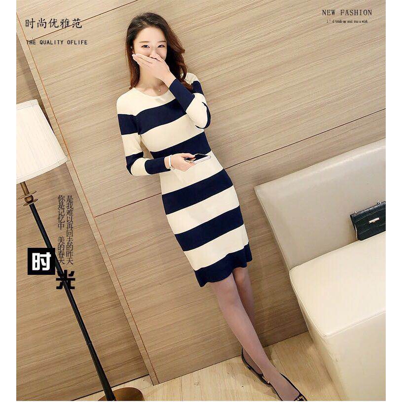 Korean Long Sleeves Stripe Trendy Clothes Knitted Dress Bvq