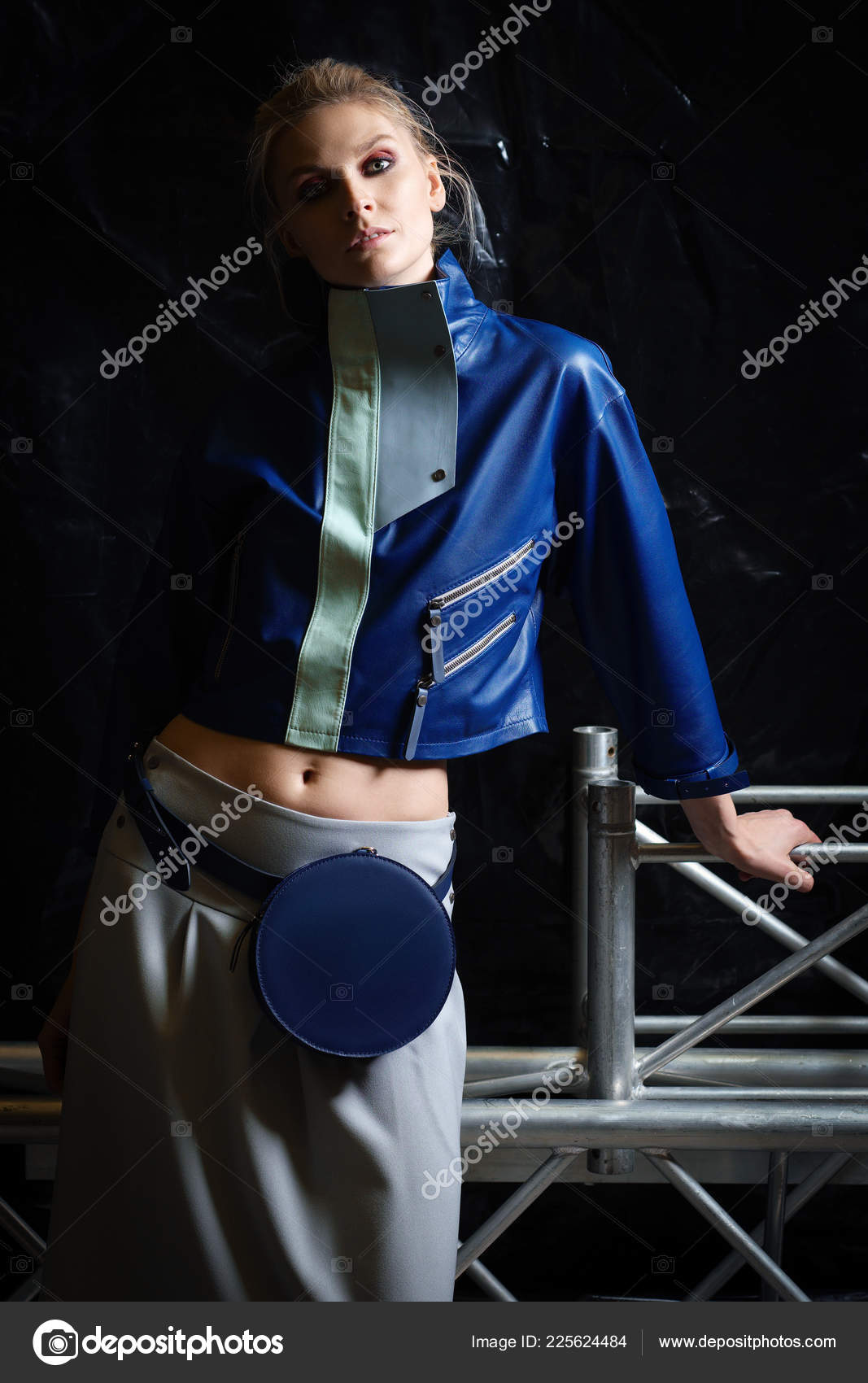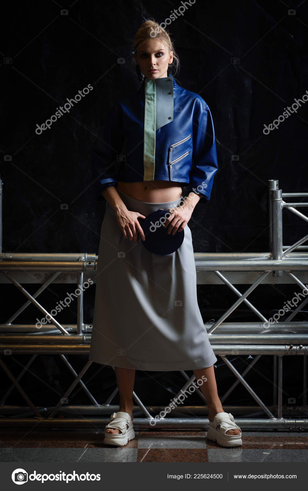 Girl In Trendy Outfit Wide Oversized Leather Jacket And Skirt