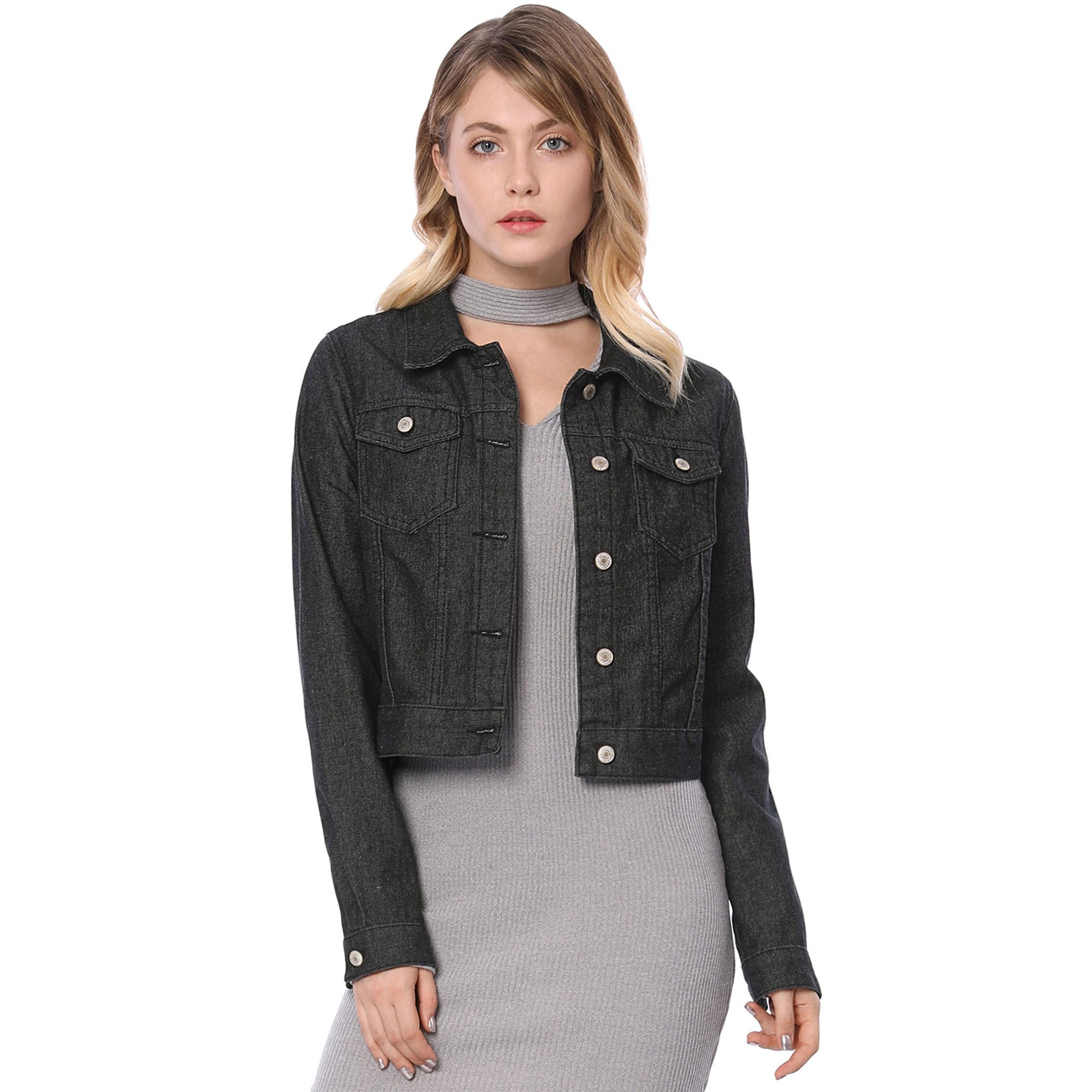 Women S Convertible Collar Long Sleeve Classic Denim Jacket Black