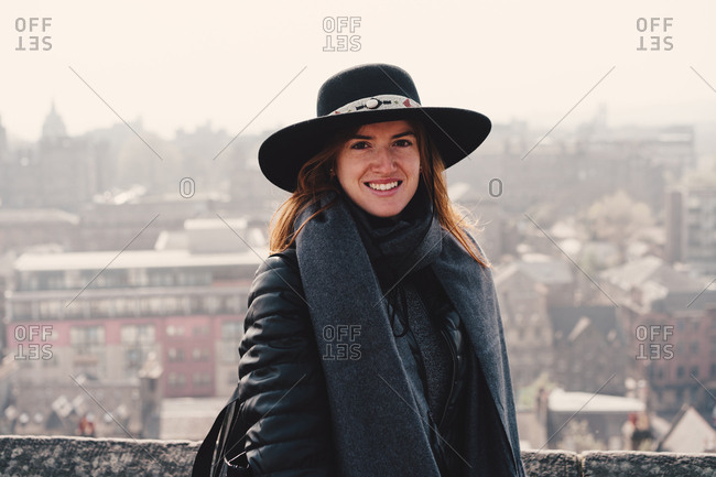Smiling Caucsaian Woman In Trendy Casual Grey Black Outfit For