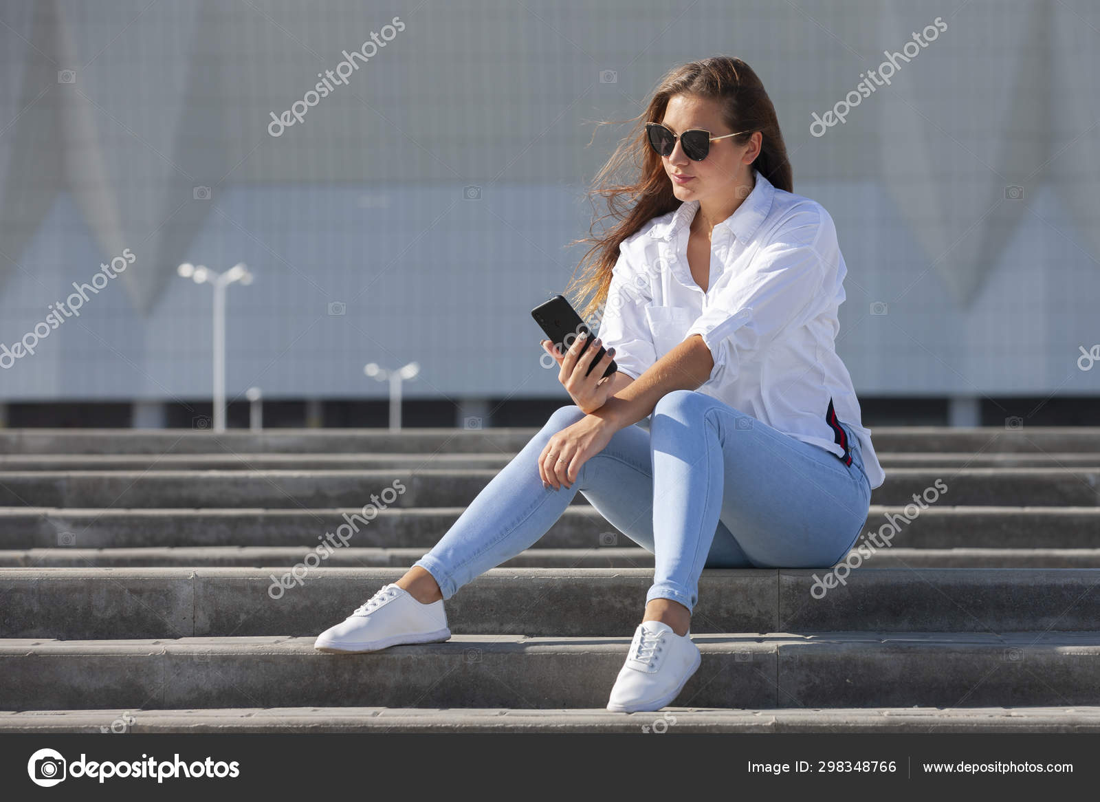 Beauty Fashion Model Girl Dressed In Jeans And Sneakers Holding